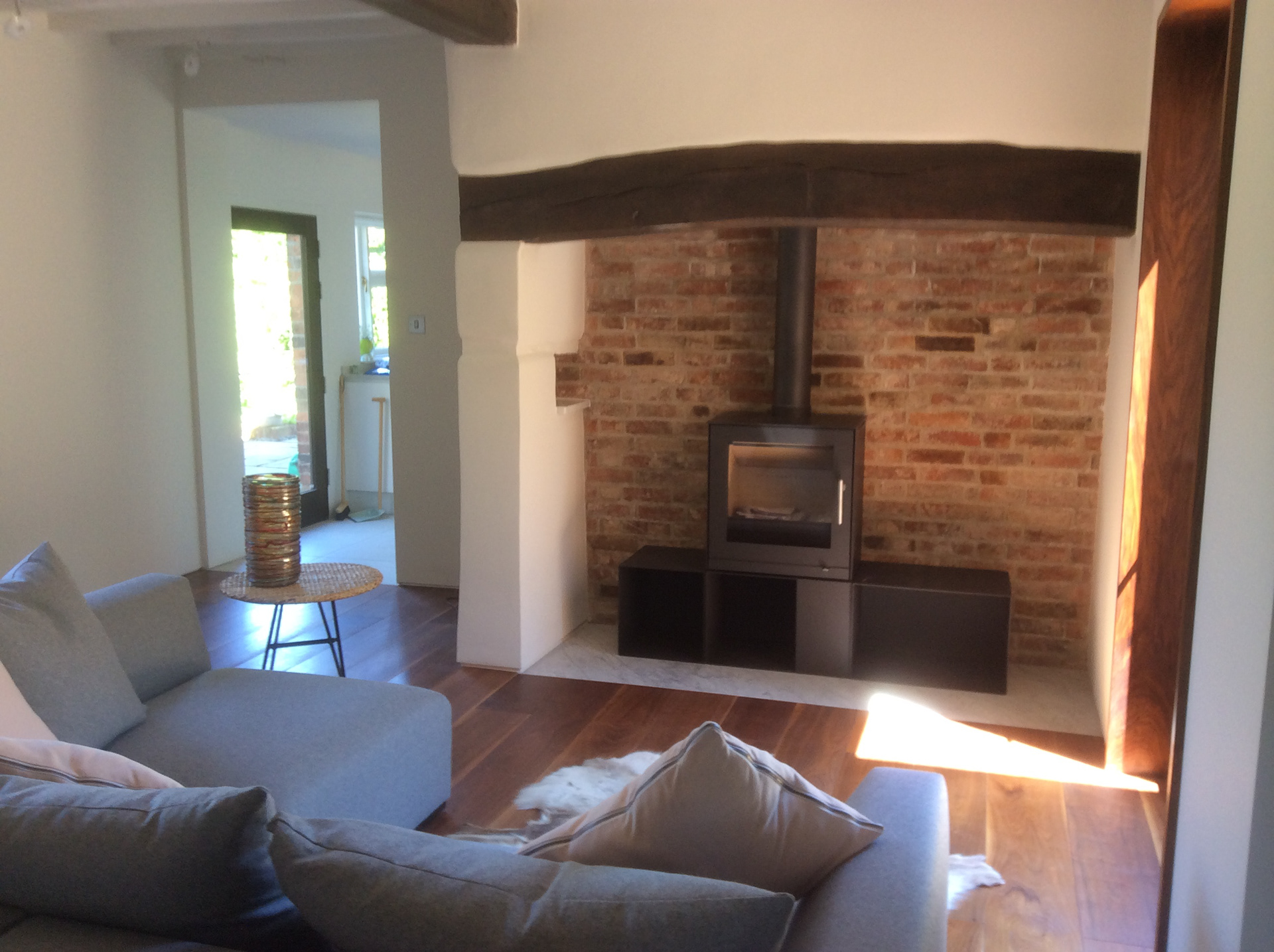 A new open plan kitchen is developed interlinking with a central lounge area and dining room to include development of a feature inglenook fireplace with log burner that was previously blocked up creating a communal heart space to the house.