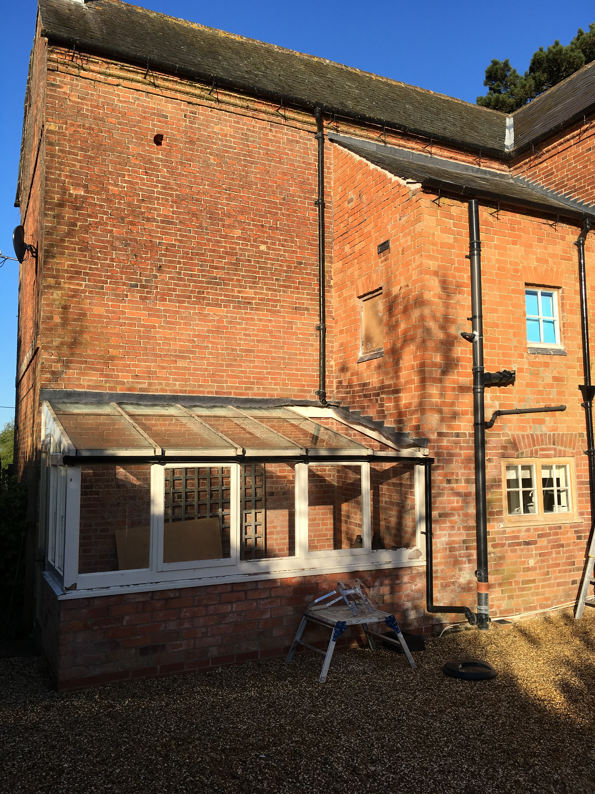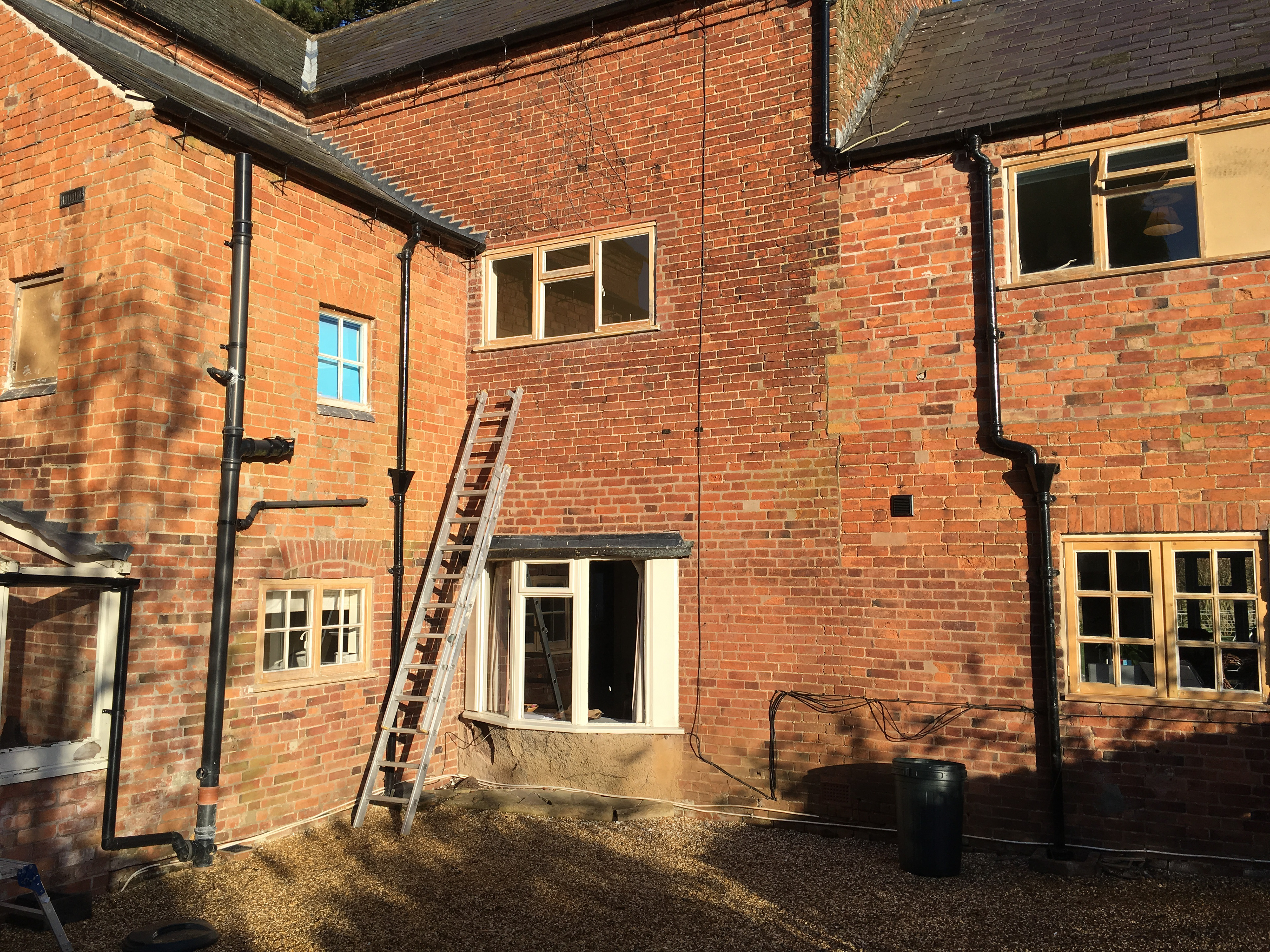 The house fabric and condition was in a poor state of repair having undergone various poorly considered interior re-plans and extensions made over time without recourse to a cohesive plan. This included the introduction of poorly located and planned bathrooms with unsightly drainage set externally around the elevations of the house. Caused by poor interior room layout planning with poorly positioned doors and lack of drainage.